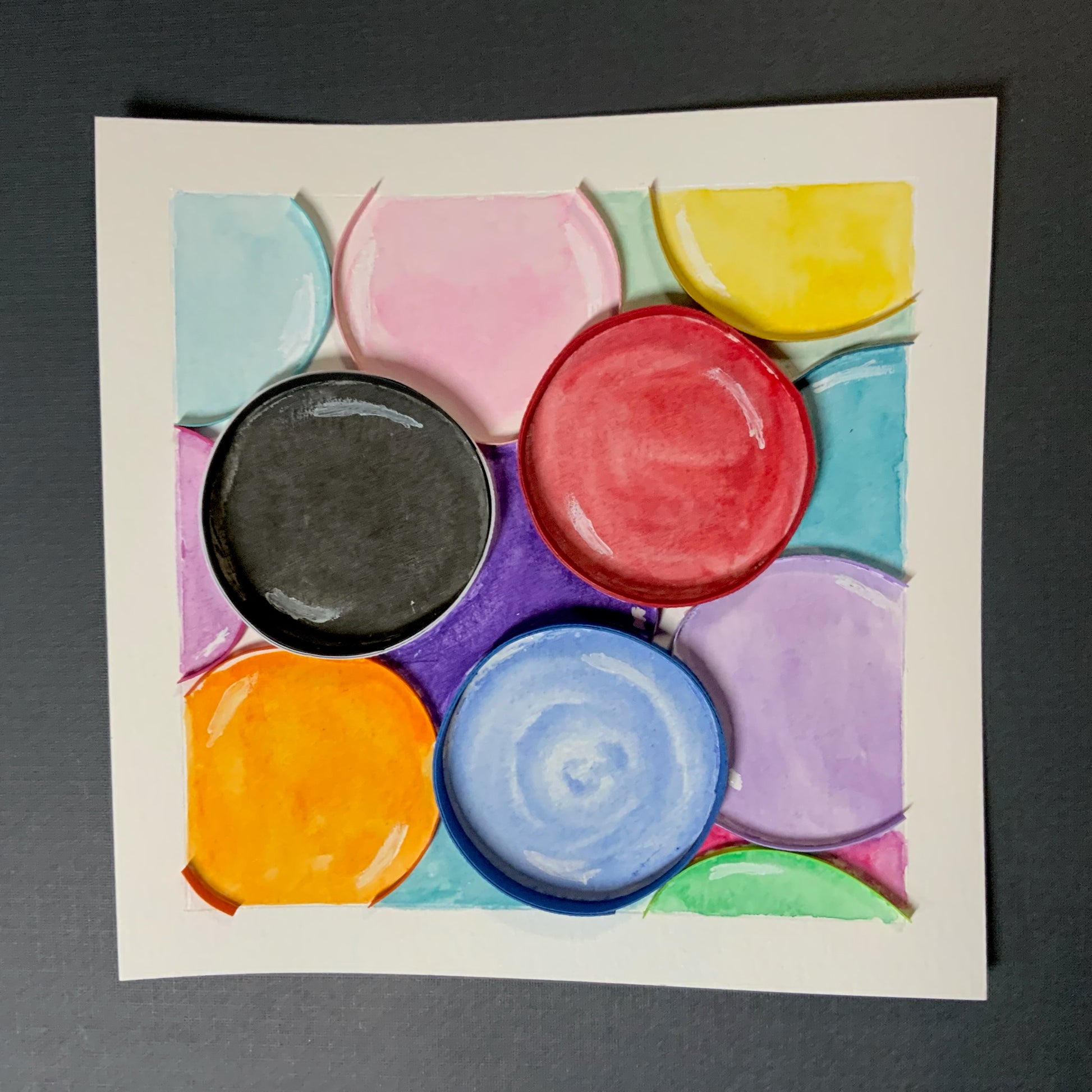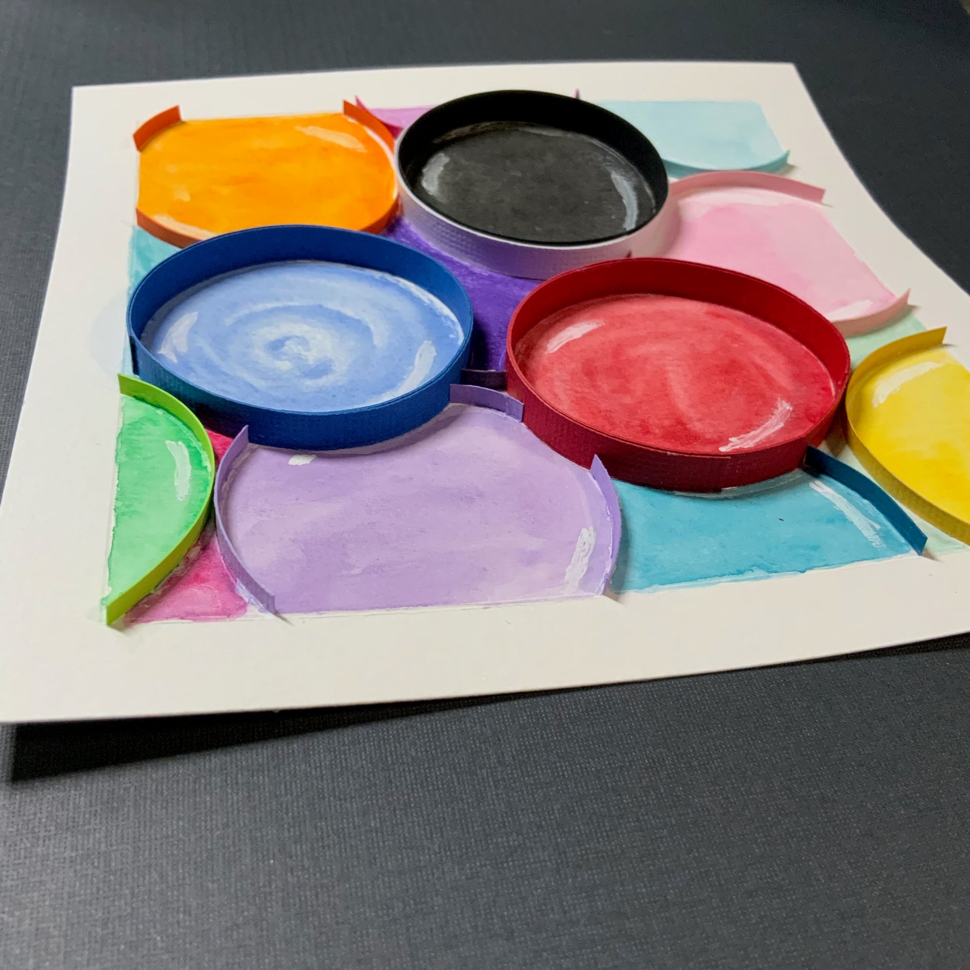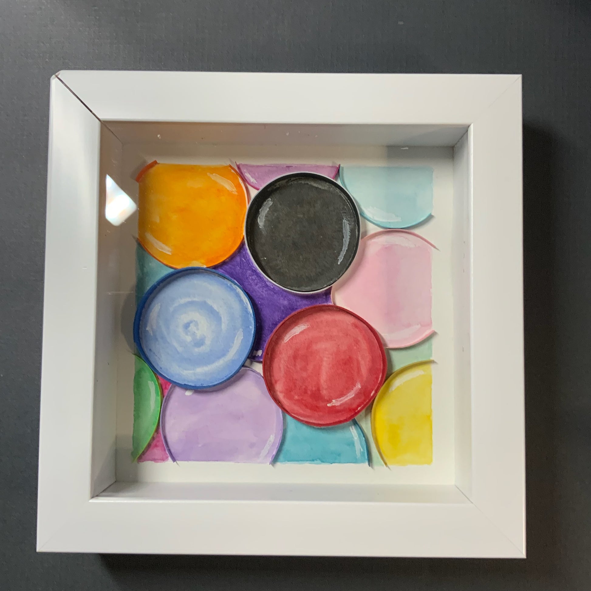 “Bubbles Bubbles” is a tall tones of rainbow of colors circles quilled in 3mm paper strips in a white 6"x6"x(x2")shadow box.