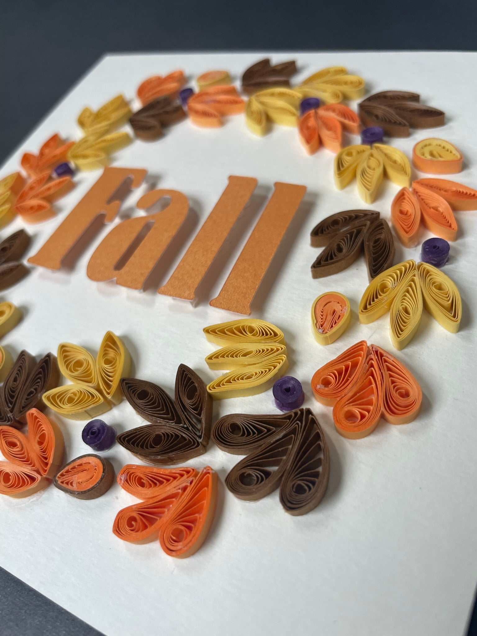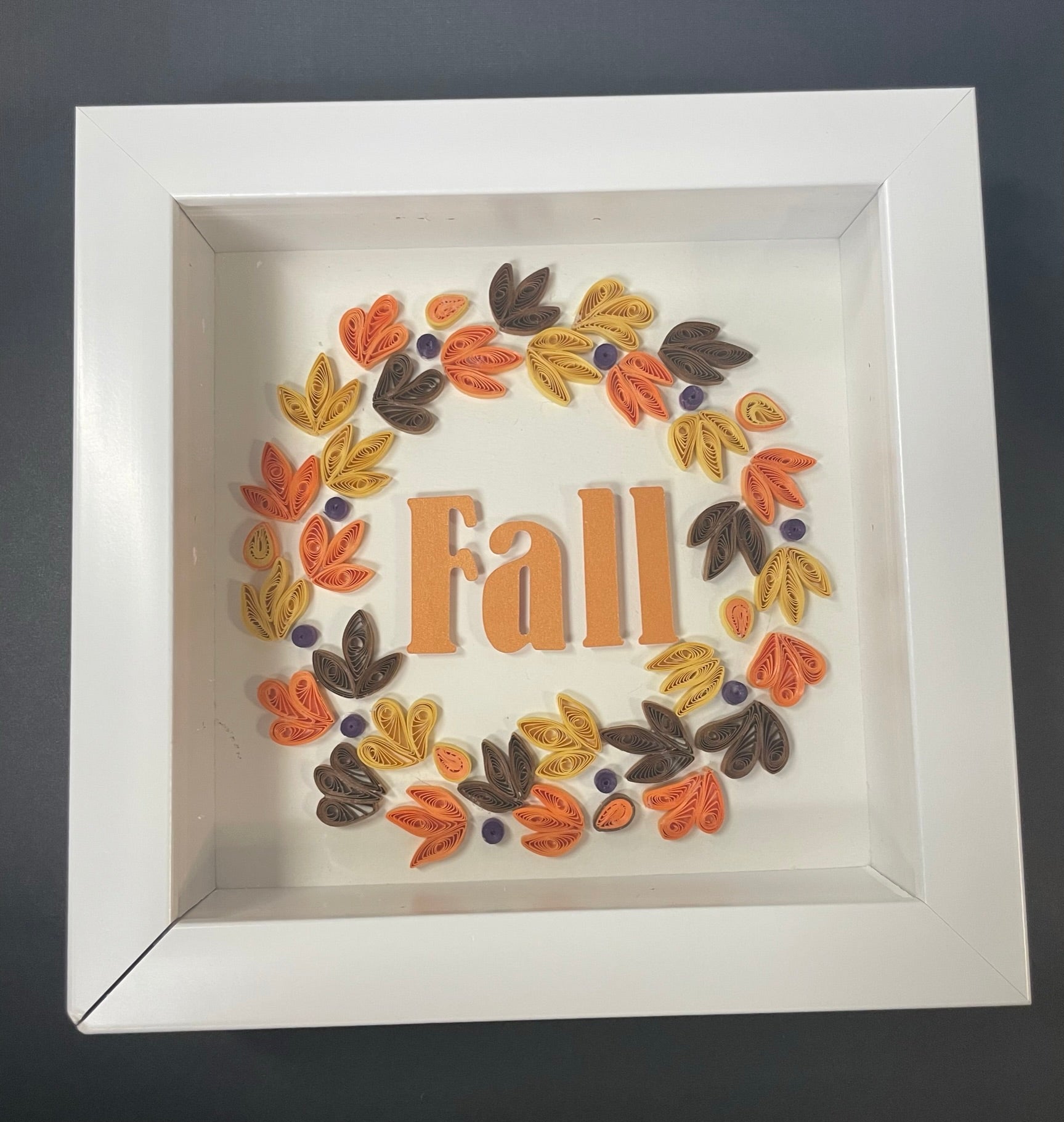 “Fall” is the perfect art for those warm fall vibes paper quilled leaves in orange, yellow & brown 3mm paper strips with purple accents in a white 6"x6"x(x2")shadow box.