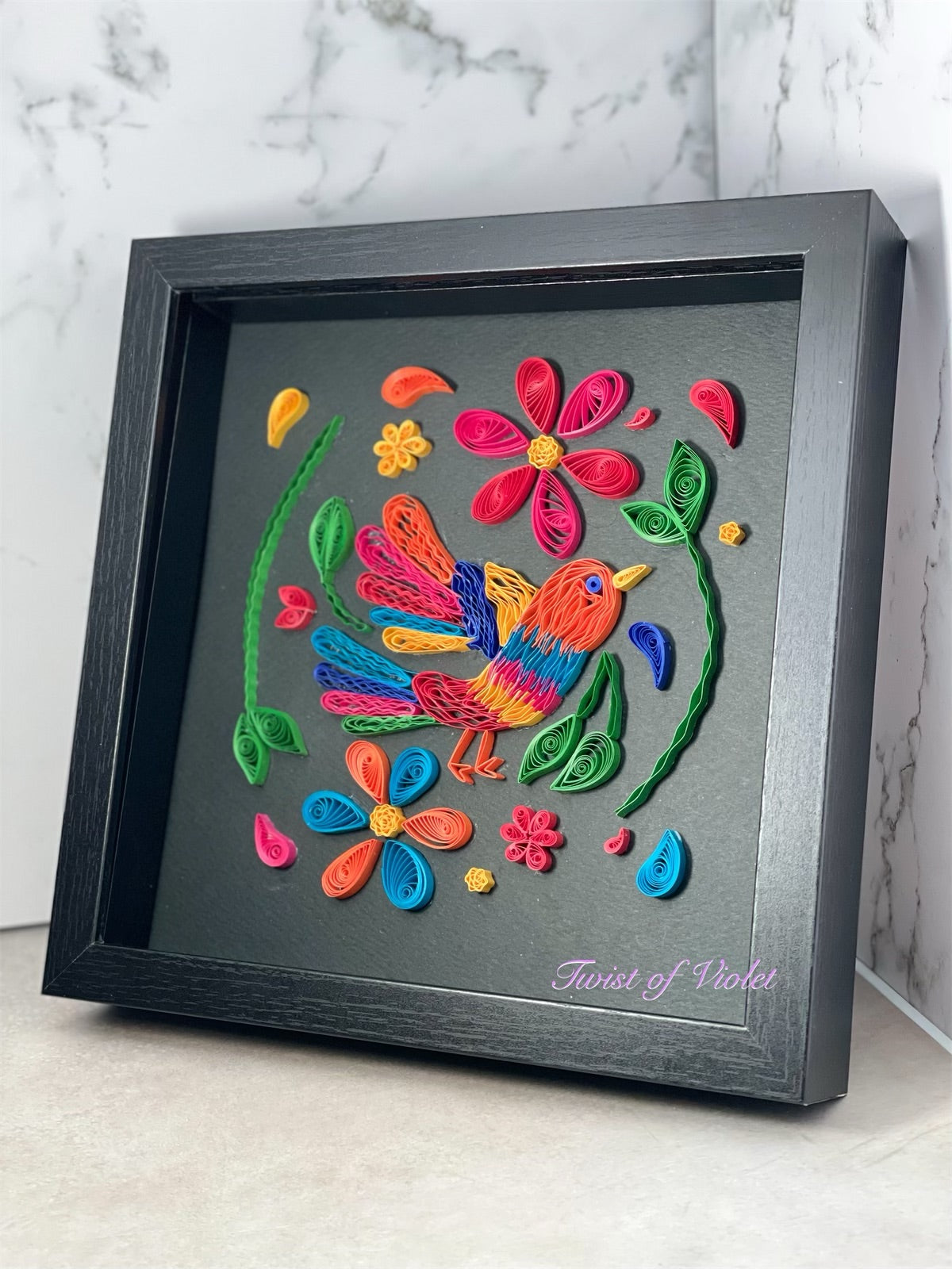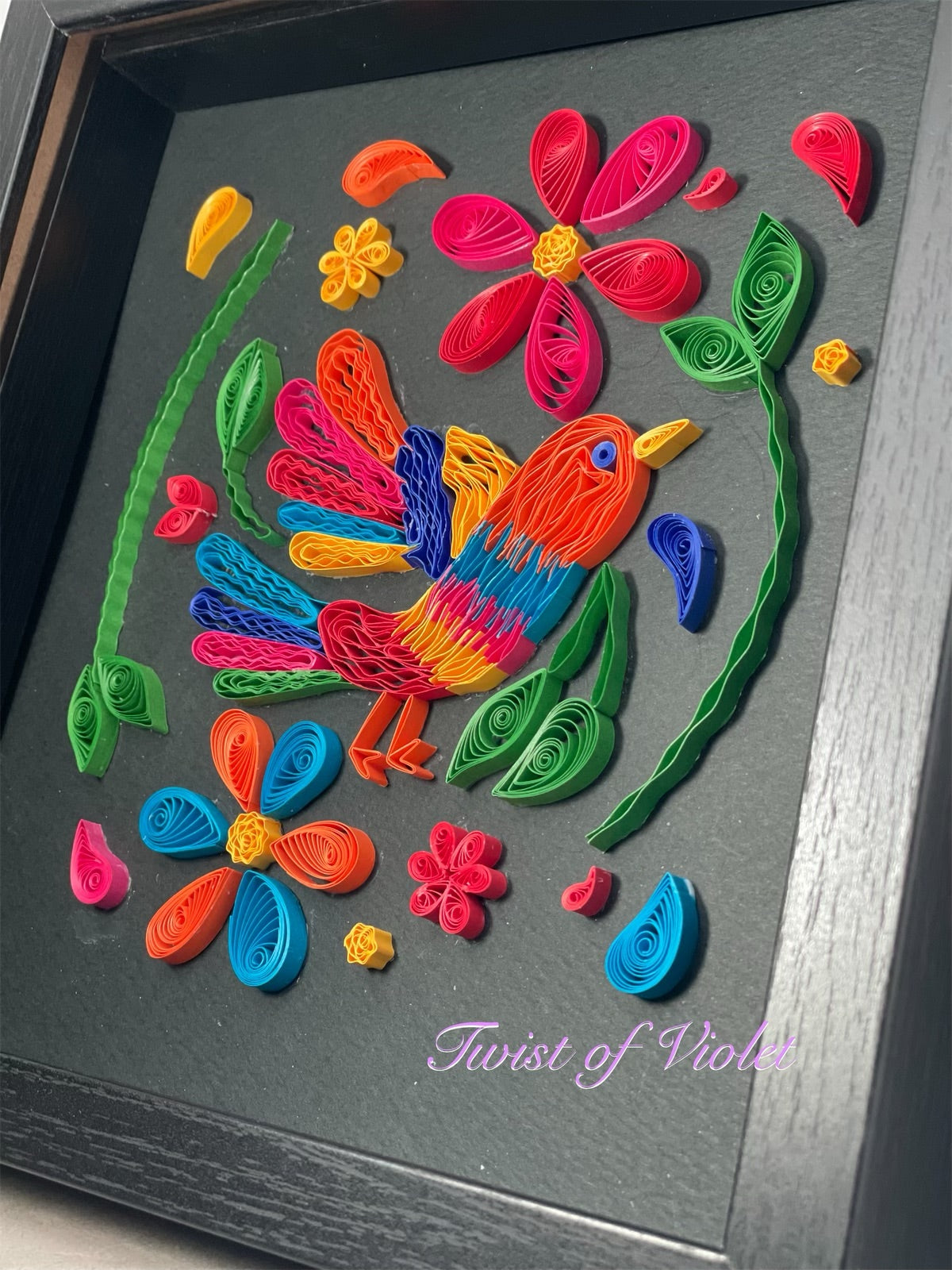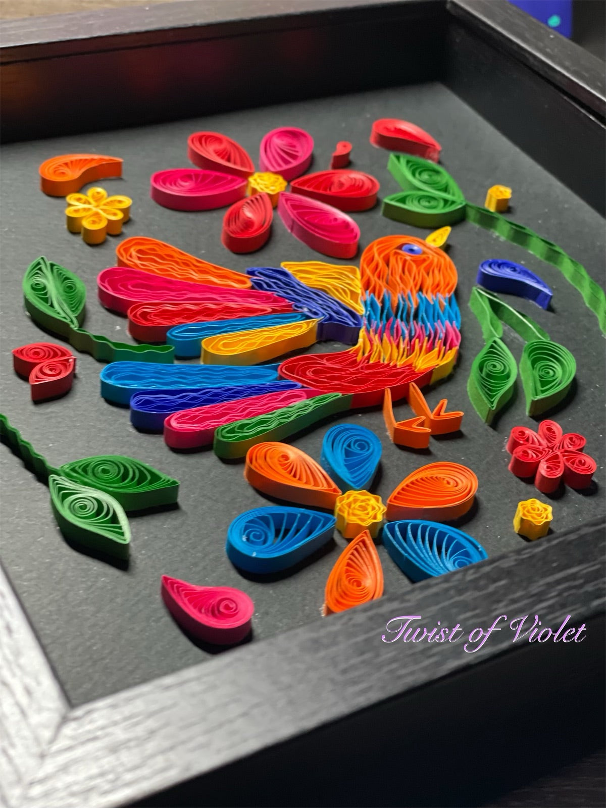 Colibri quilled an an assortment of bold colors on a black background in a Black 9"x9"x(x2")shadow box hand quilled with 5mm of paper.