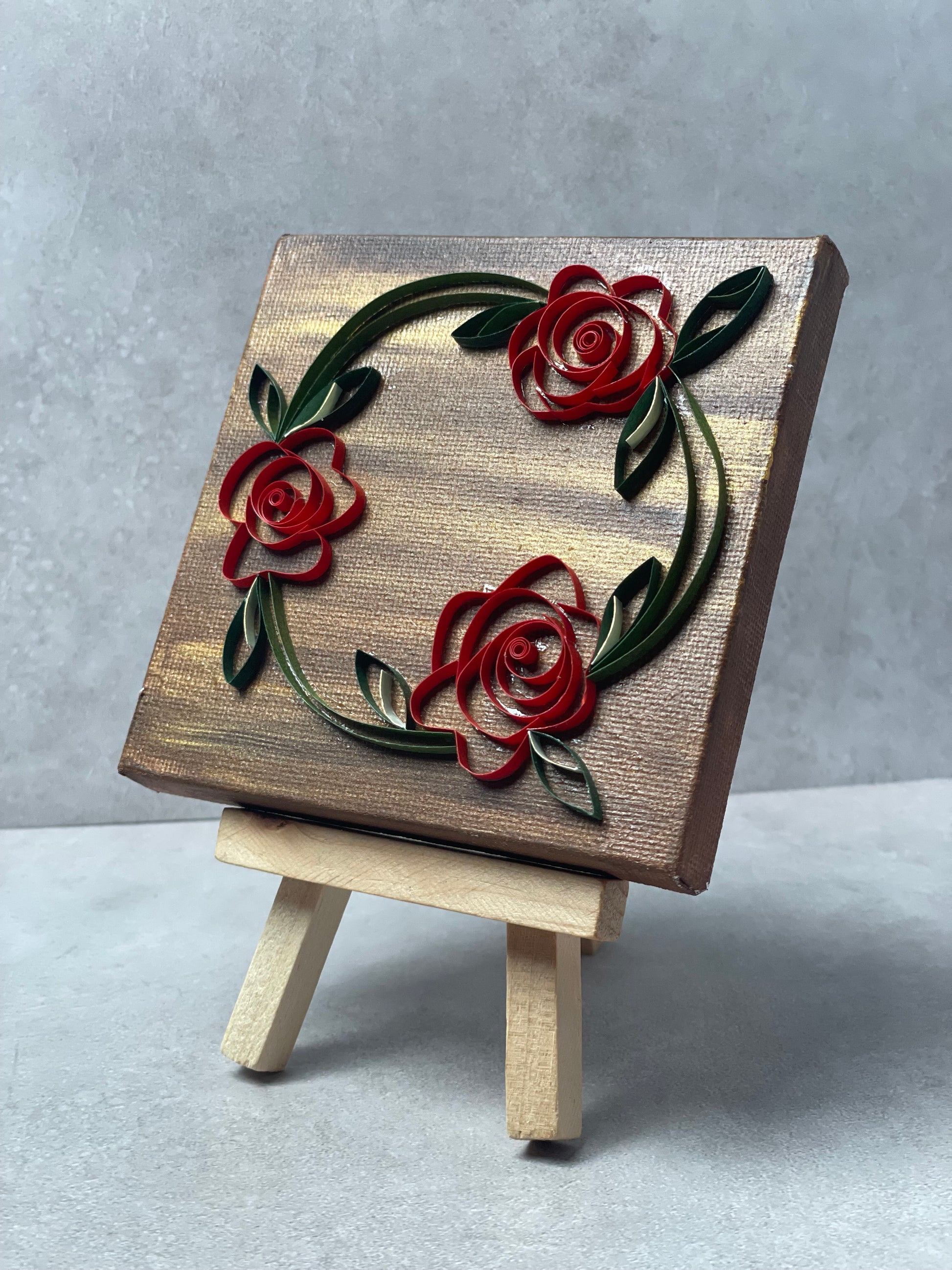Flower Series, Red Rose and green leaves quilled on a 4" x 4" brown and gold painted canvas with 3mm quilling strips in the shape of a wreath.
