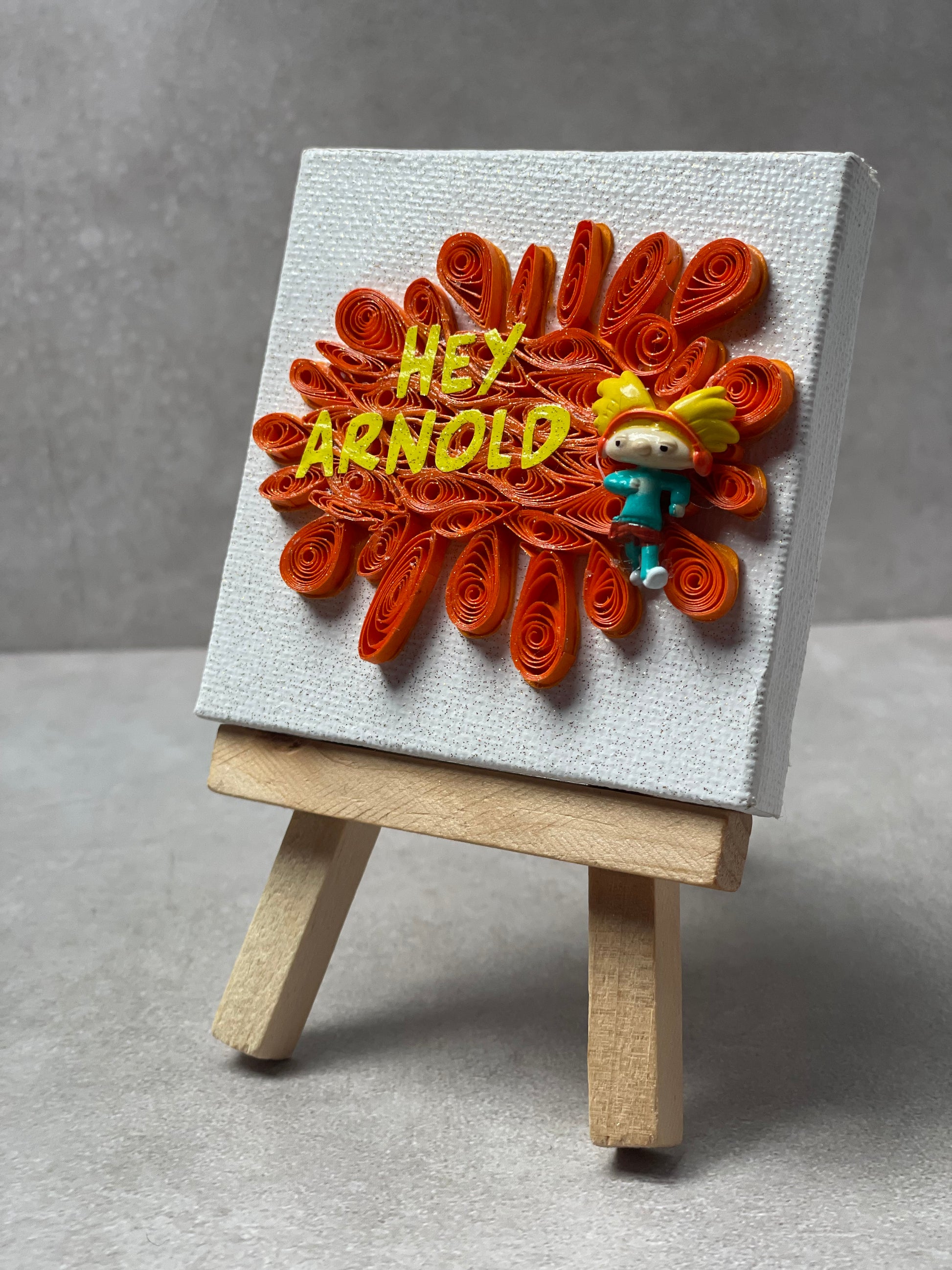 Mini Brand Toy Art Series, Arnold with Nickelodeon Orange Splat quilled on a 3" x 3" White canvas with 3mm quilling strips.